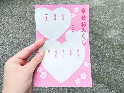 可愛らしいピンク色の幸せおみくじです。早速私も運試し。