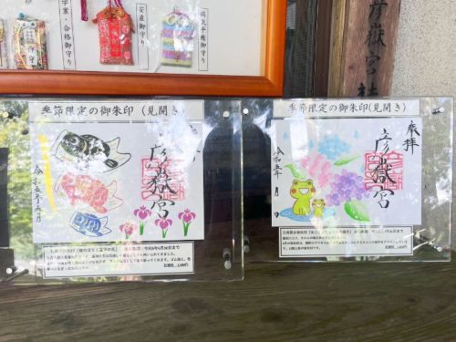 こちらは季節限定の御朱印です。左が5月の御朱印で6月30日までもらえます。右が6月の御朱印、こちらは7月31日まで。季節限定の御朱印は毎月2種類ご準備されています。