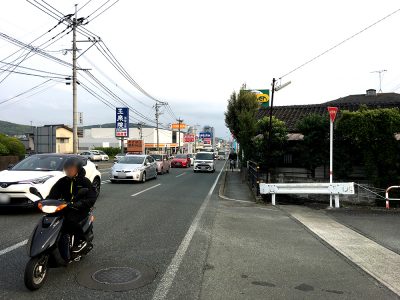 熊本市中心部から進む途中、左手にガリバー清水バイパス店を過ぎ、少し先の道を左折。