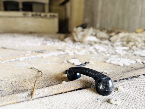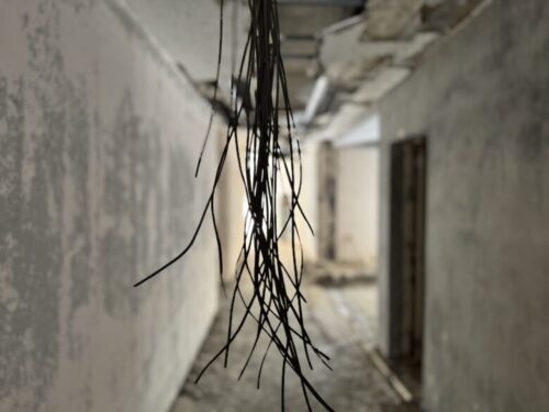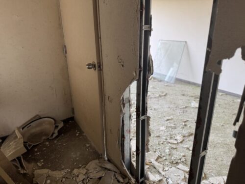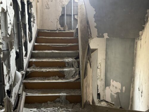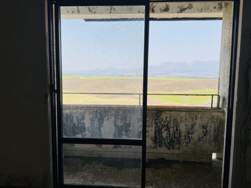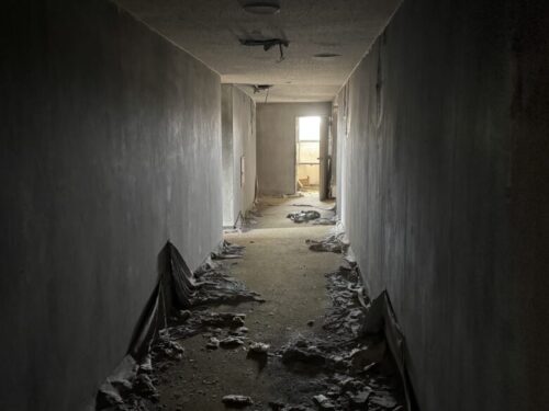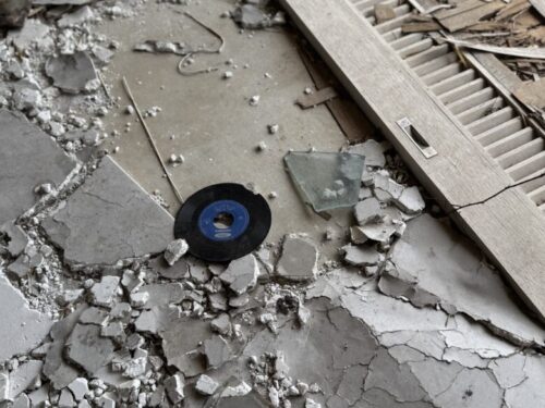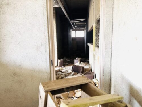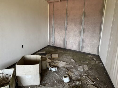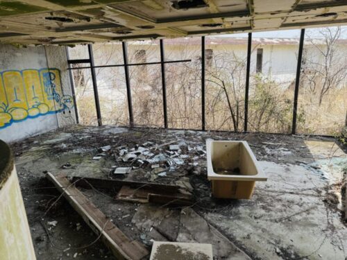 バスタブが放置され、ガラスはなく風がびゅんびゅんと入ってくる