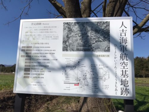 人吉海軍航空基地は、太平洋戦争末期に、出水や鹿屋、宮崎などの南方の基地との中継基地としてつくられ、活動期間はわずか1年9ヶ月と短いものでした。当時使われていた滑走路は今なお残っており、現在は生活道路として使われています。