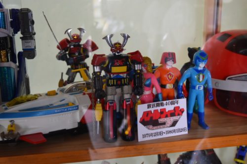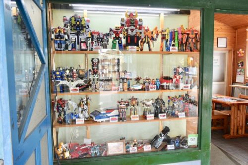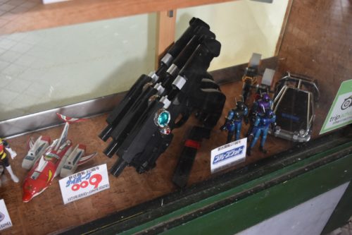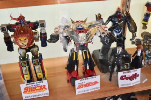 お店を見つけるとまず目に飛び込んできたのは、戦隊ロボのおもちゃの数々! お店入り口のショーケースに綺麗に陳列しています。