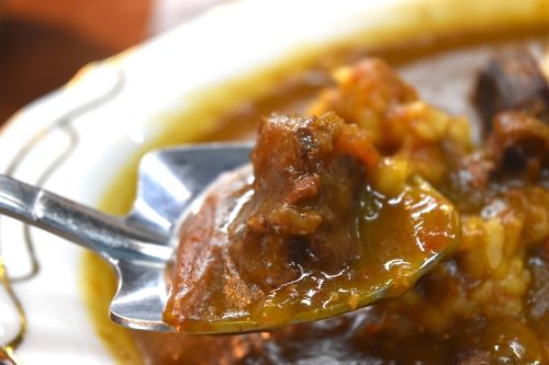 高森町の酒粕に漬け込んだ猪の燻製が入ったカレーは甘口。動物性油脂を使わず、阿蘇のトマトと一緒にじっくり煮込んであるのでコクがあります。湧き水や九州産小麦粉を使うなど、食材にはこだわりがありました。