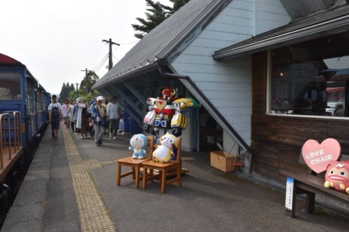 どことなく寂しそうな顔をしている看板ロボのギンガイオーは、外でドラえもんとラスカルと一緒に、トロッコ列車に乗ったお客さんをお出迎えしてくれます。
