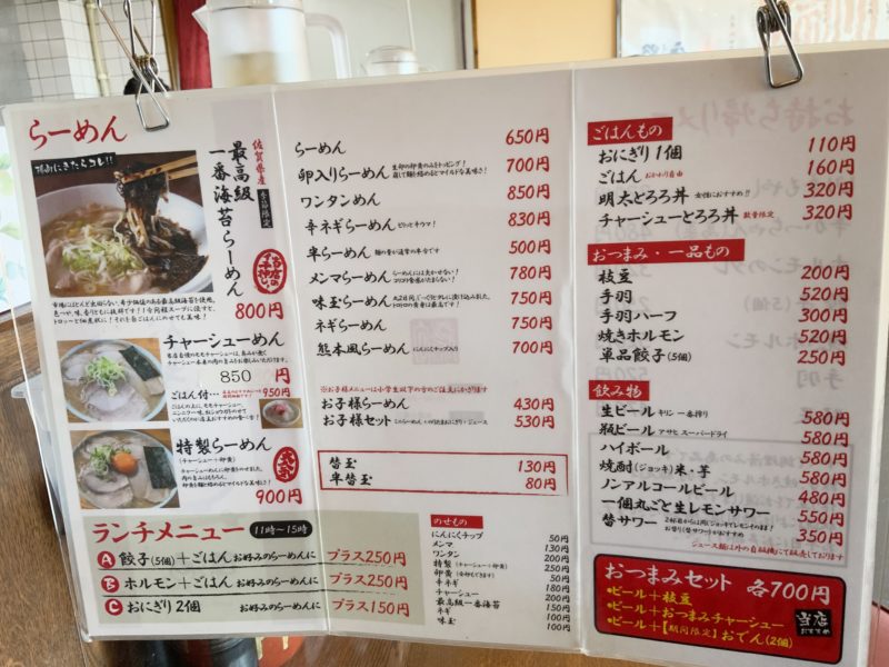 お店のイチオシは佐賀県産の海苔を使った「最高級一番海苔らーめん(税込800円)」ということですが、初めてお邪魔したので基本の「らーめん(税込600円)」をいただきました。