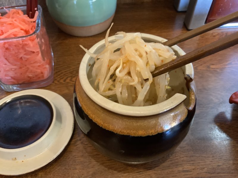 ピリ辛のもやしと、高菜、紅生姜も席に用意してあり、自由に取ることができます!