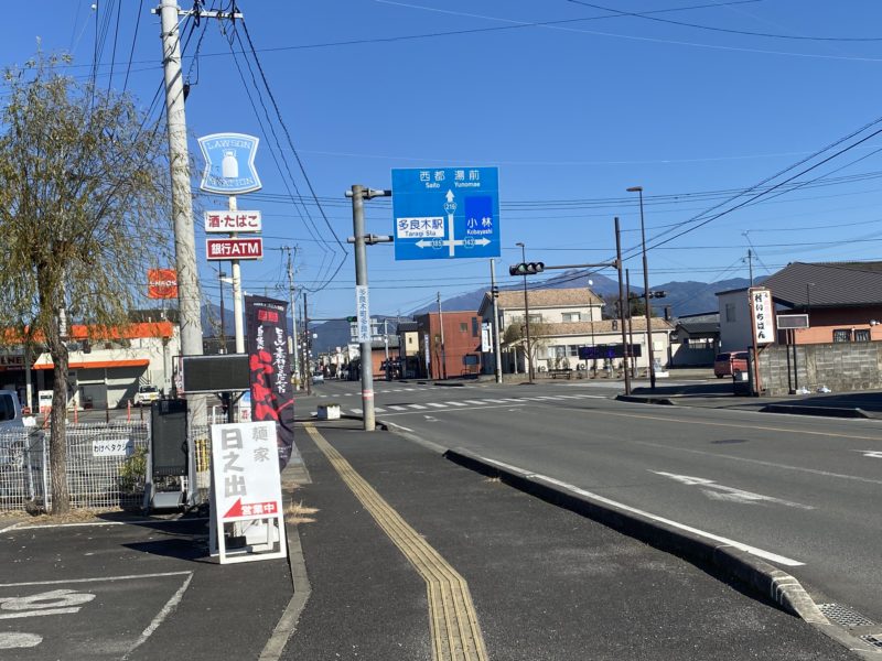 人吉方面から多良木駅に向かって進み、手前に「営業中」の看板が出ています。