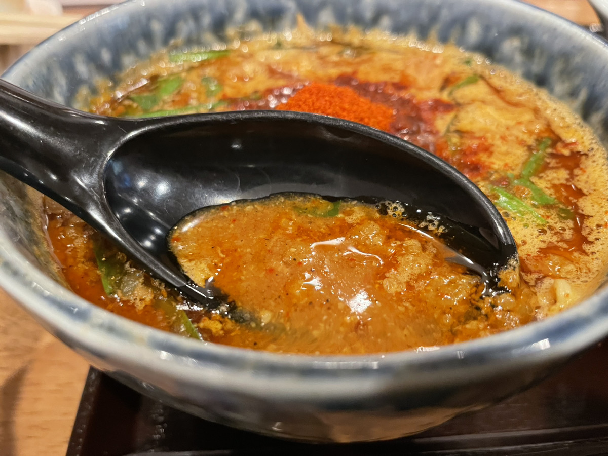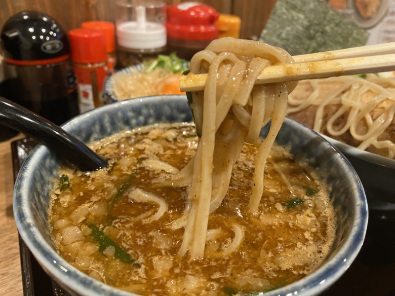 赤味噌の風味が感じられて、つけ汁の濃厚さがツルっとした麺によく絡みます。