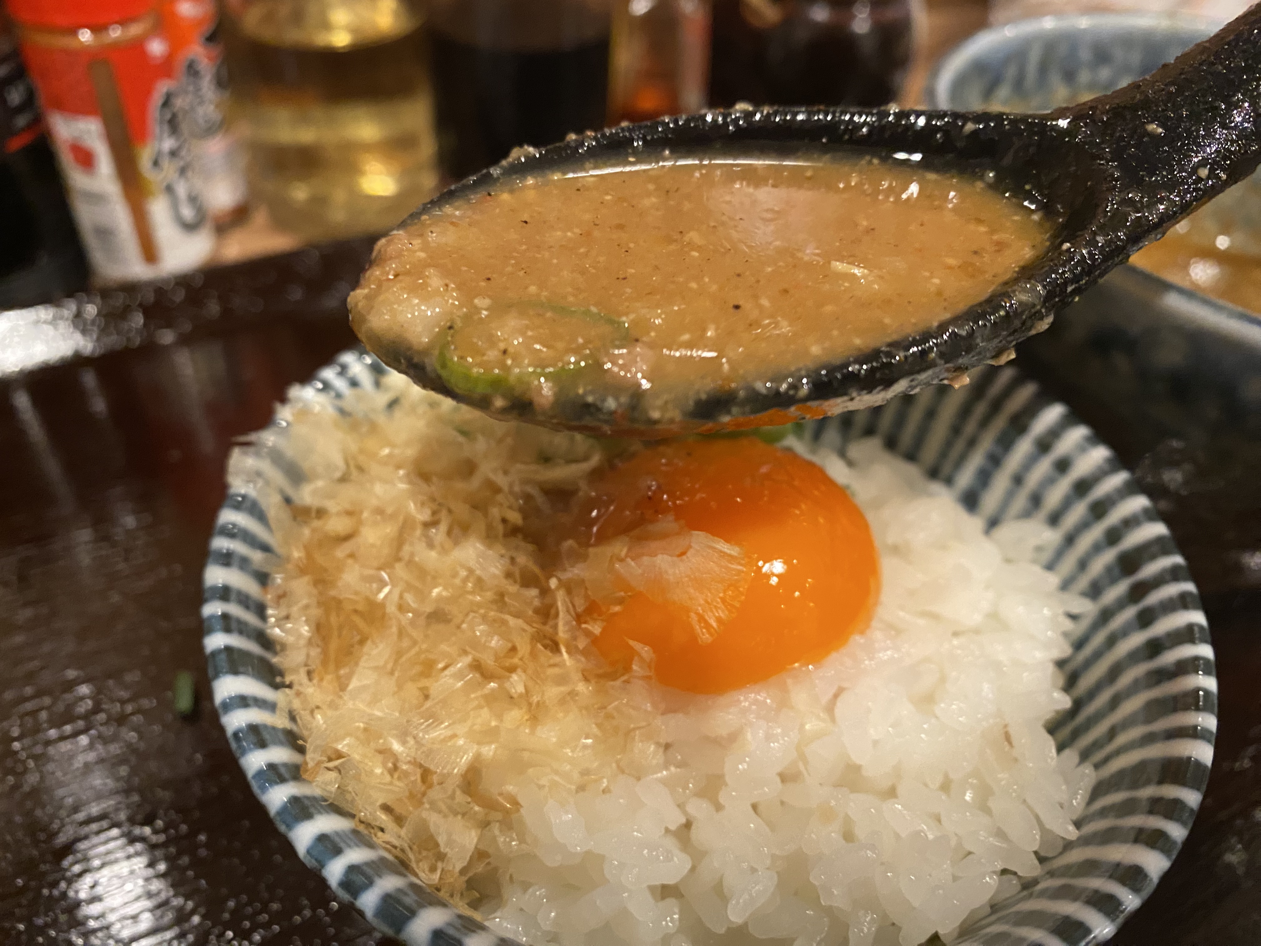 ぶっかけ飯は、ご飯だけかと思ったら、卵と鰹節とネギ入り。