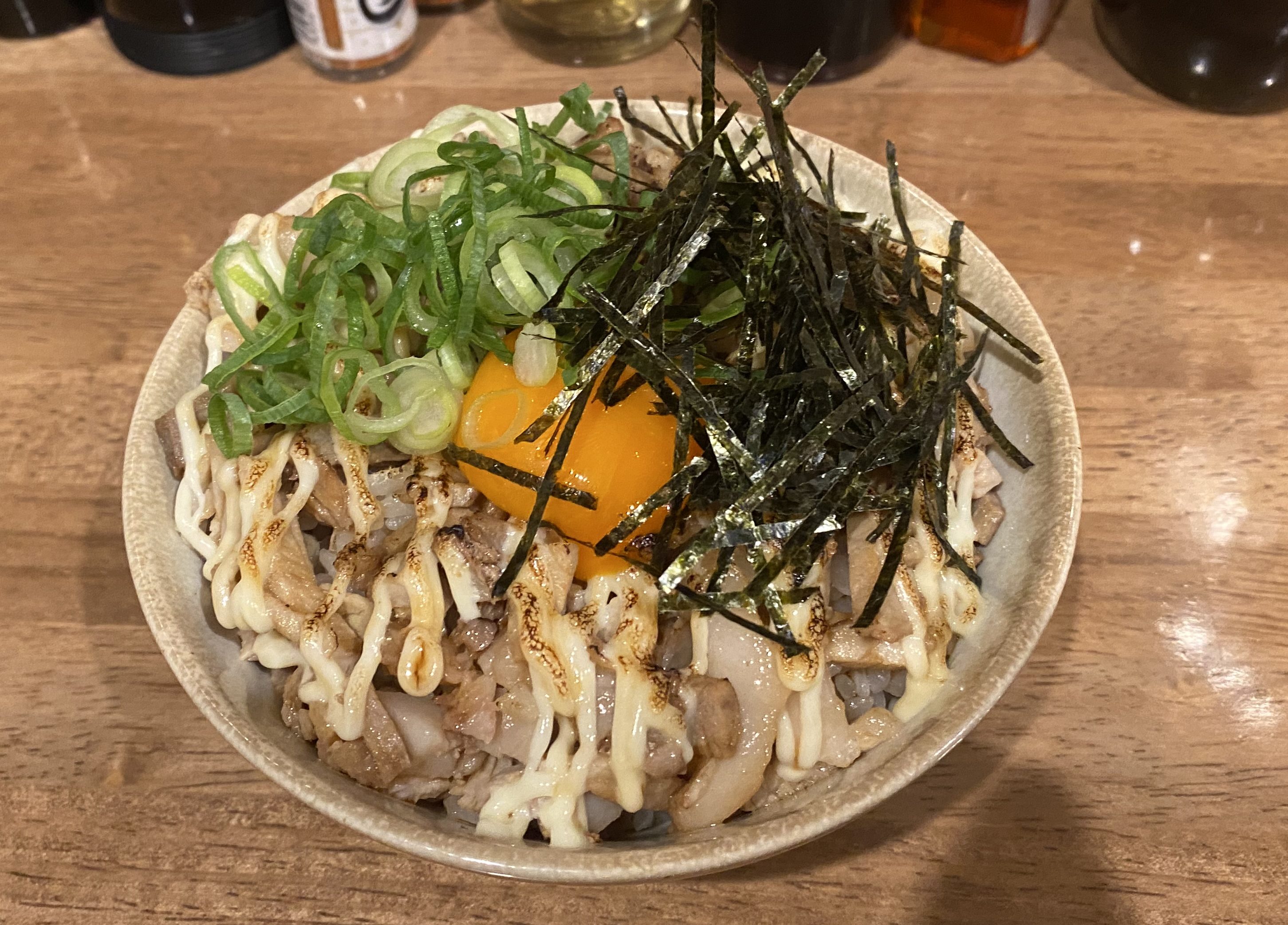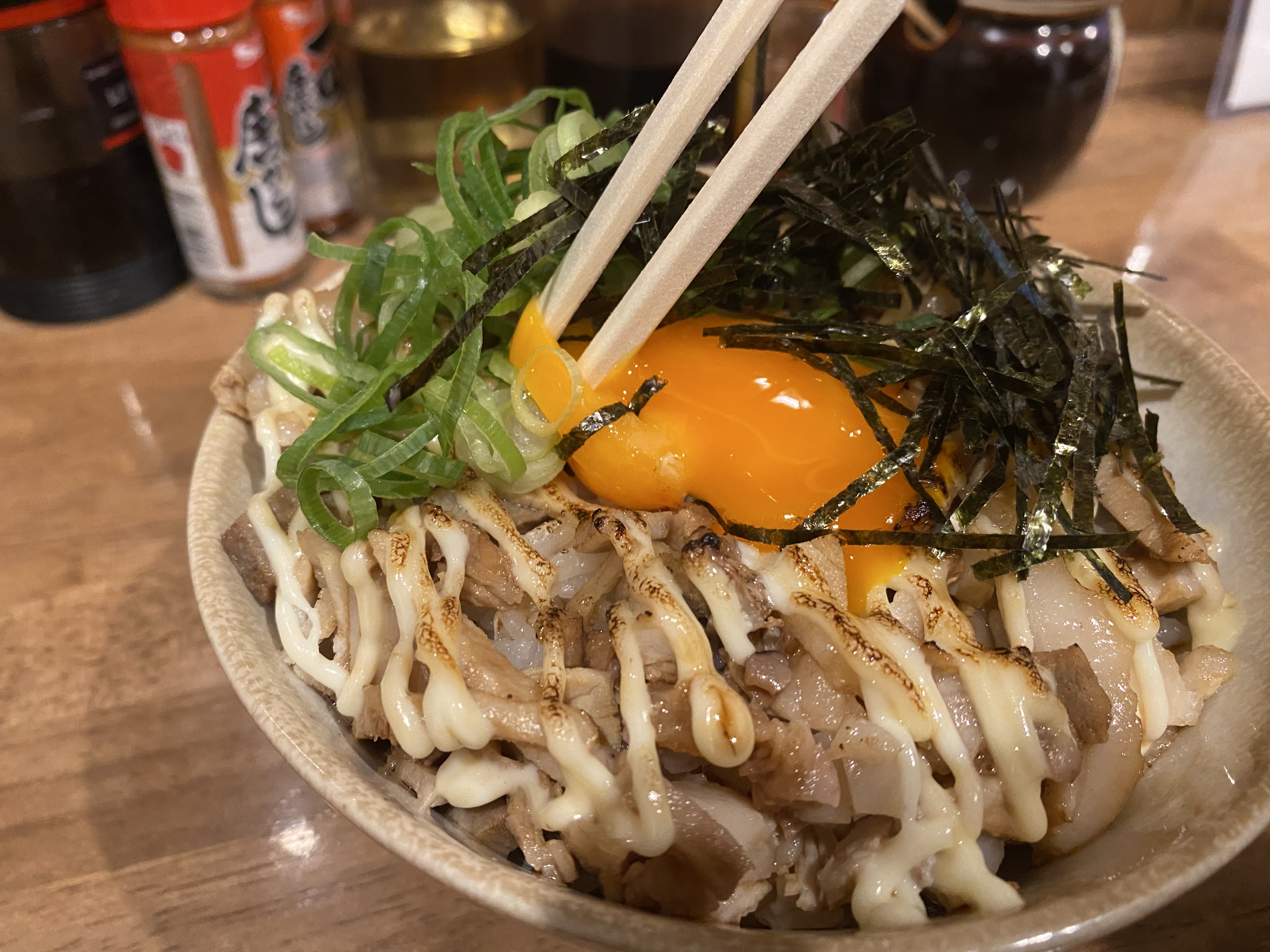 炭火で焼かれたチャーシューの上にマヨネーズをかけて、さらに炙ってあります。