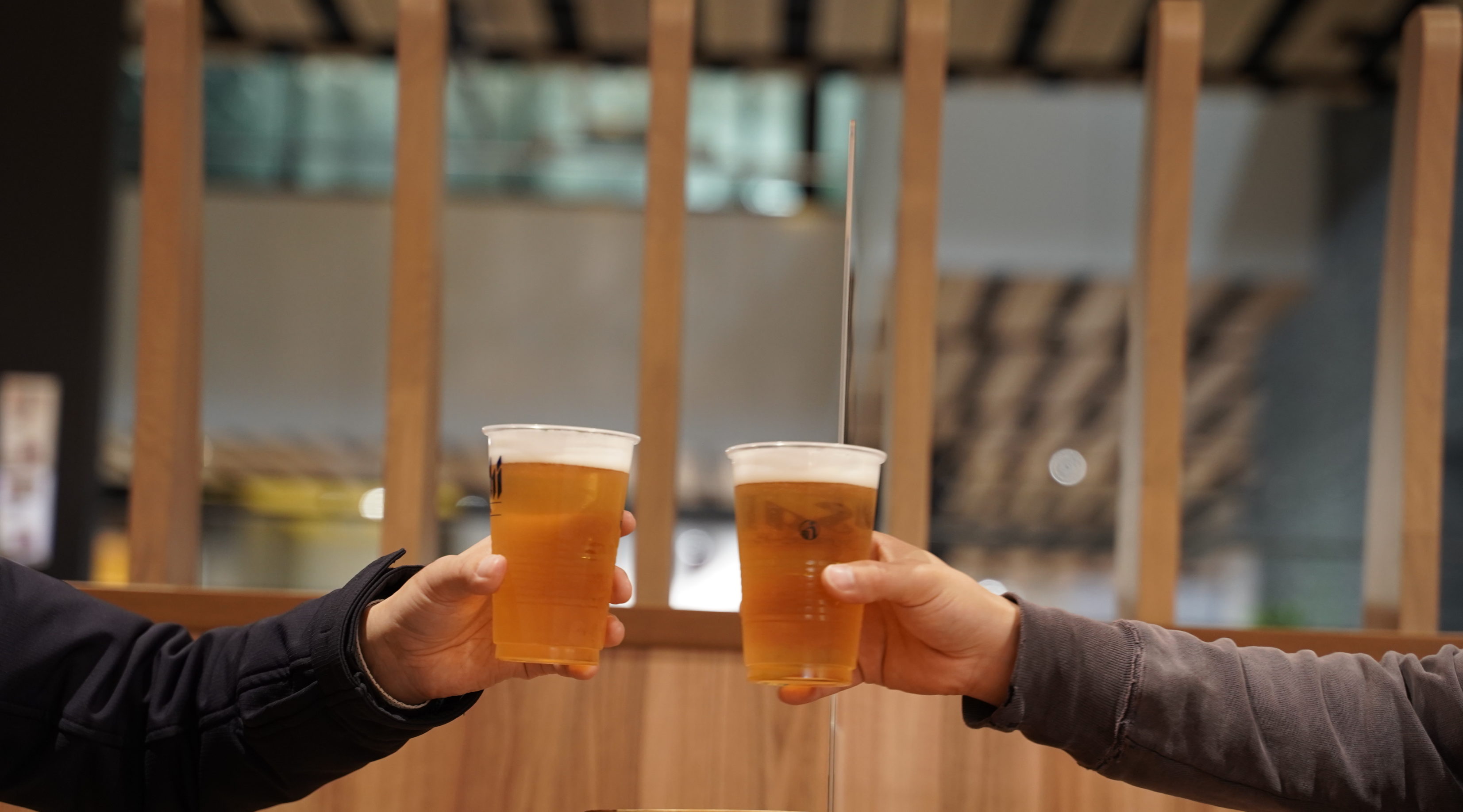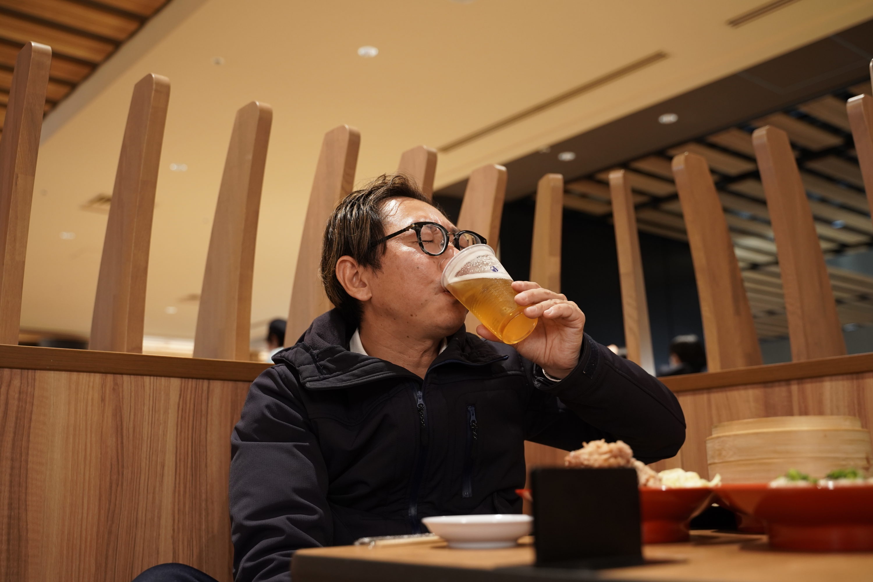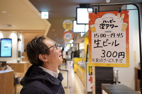 広々としてて、くつろげるんですこれが。1分待てばビールが登場。