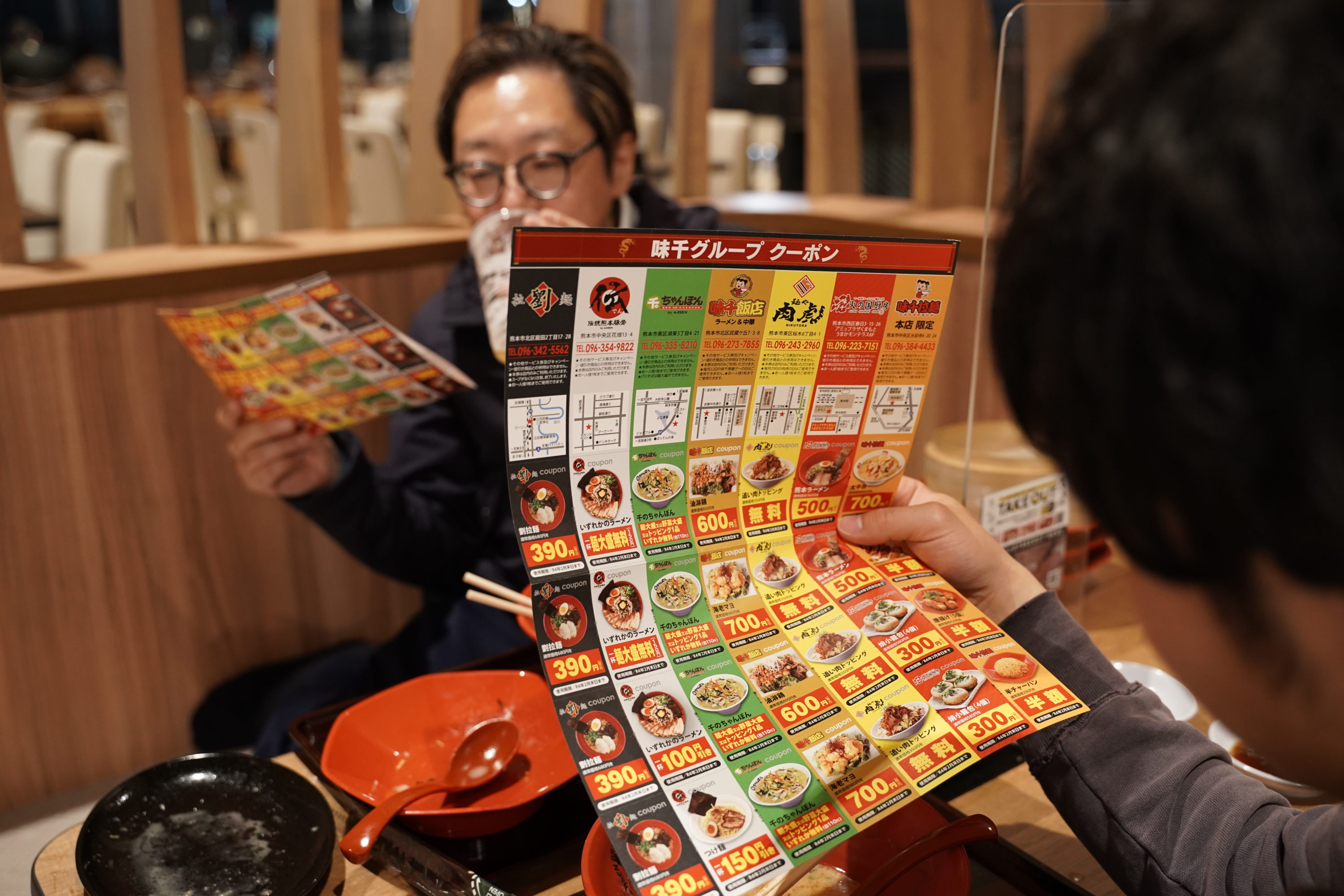 味千グループのクーポン券いただきました、目を通してるうちに二人の脳裏には、2回目の忘年会どこにしようという妄想が…。