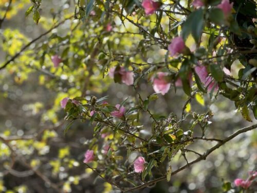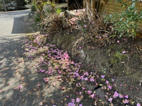 ボトリと落ちた椿が、道をピンクに染めています。とてもとても静かな場所です。