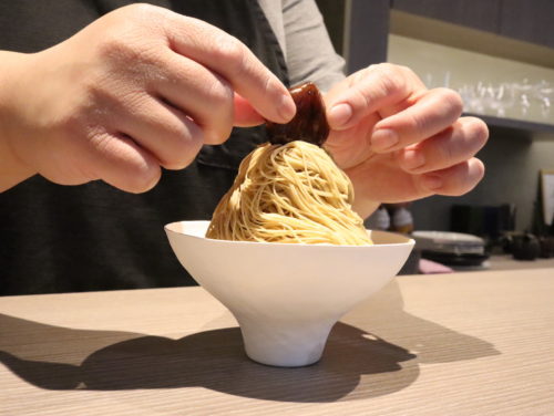 何だか博多ラーメンみたいに写っていますが、この細いのが栗のペースト。熊本県産・宮崎県産の和栗をぜいたくに楽しめます。