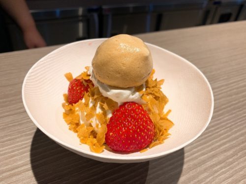 ソフトクリームの周辺にいちごとサクサクした薄焼きのクッキーを散らして、メレンゲをトッピング。