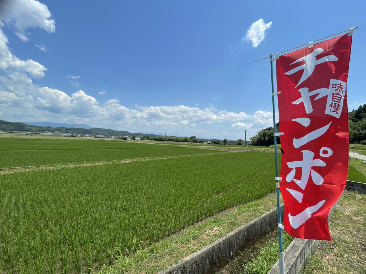 駐車場は店舗の裏にあります。広がる田園風景と山々が見渡せていい景色。