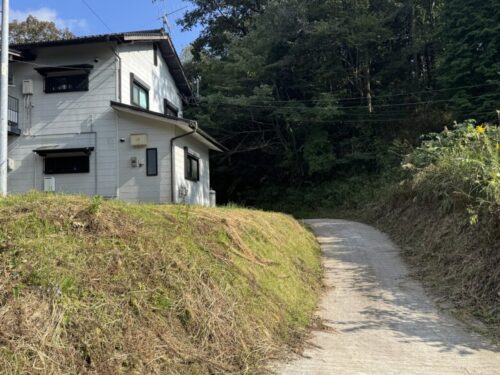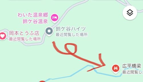 グーグルマップで見るとこのような感じです。「鈴ケ谷ハイツ」より先の道は表示されませんので、ご注意ください。赤い矢印の部分が舗装されていない道になります。切り返しなどが大変なので、小さめの車がオススメです。