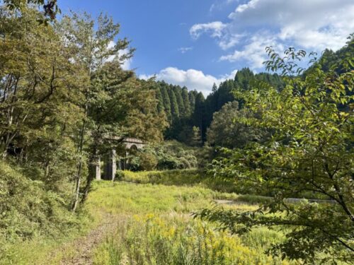 こちらが、昭和12年(1937)に完成し、昭和59年(1984)に廃止となった旧国鉄宮原線です。現在は遊歩道として使われているとの事でしたが、草がぼうぼうで歩いて行く事はなかなか困難でした。