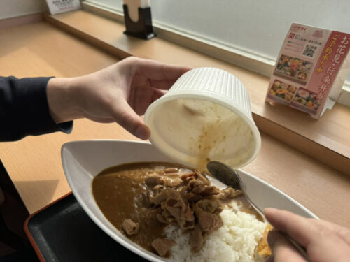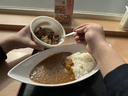 ここは大学の学食だったかな?ってくらいこなれた様子でカレーをもらう、ひさちー(仮)。