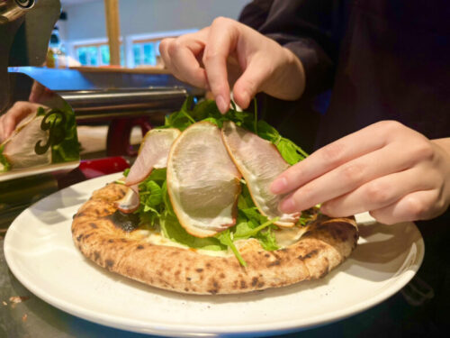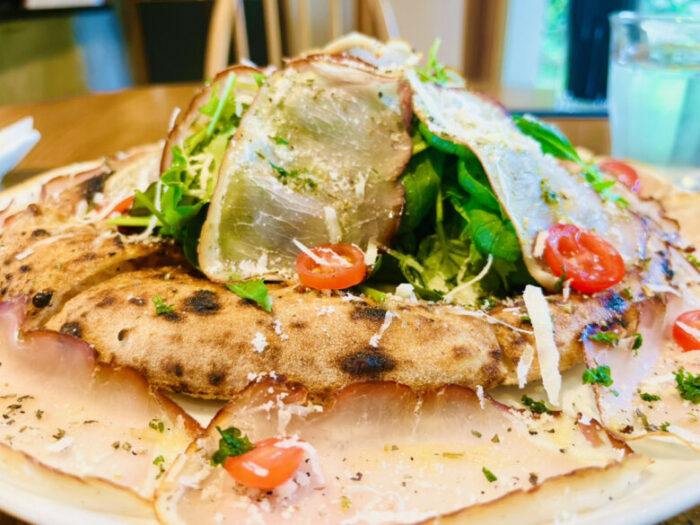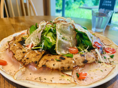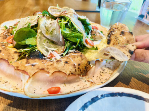 ピザ生地の周りまでたっぷりと敷き詰められている生ハムたち!和水町産のベビーリーフ、塩味の効いた自家製の生ハム、熊本産のミニトマトがふんだんにのった贅沢な逸品に感動しました!!!