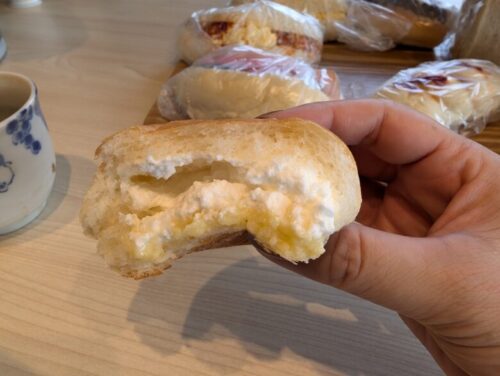 フワフワのパンに程よく詰まったカスタードに生クリーム。甘すぎなくて朝食にもいける!
