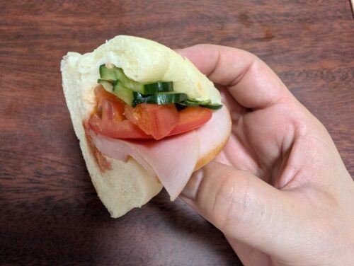 ハムもトマトもキュウリもうわべだけ一枚…なんてことはなく、切れ目のギリギリまでたっぷり。