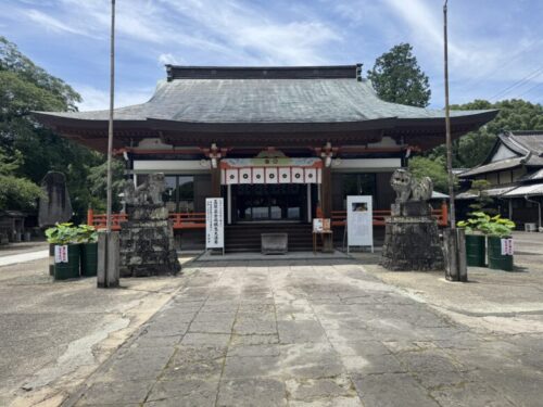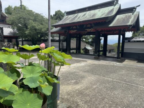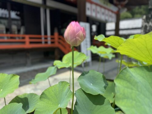 拝殿の前の蓮の花が夏に向けてまっすぐと空へ伸びています。