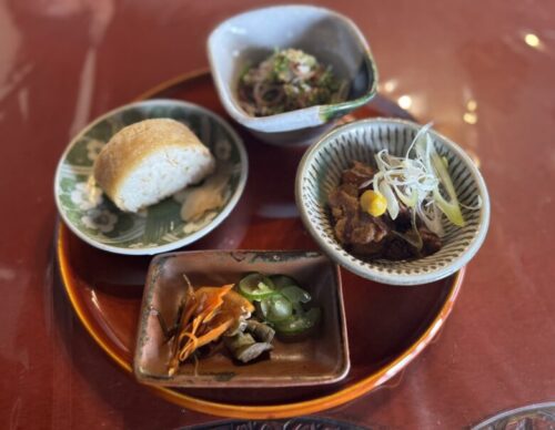 まず初めに小鉢。季節の小鉢二種と手作りのお漬物、そして南関いなりです。これだけで満足感が半端ないです。