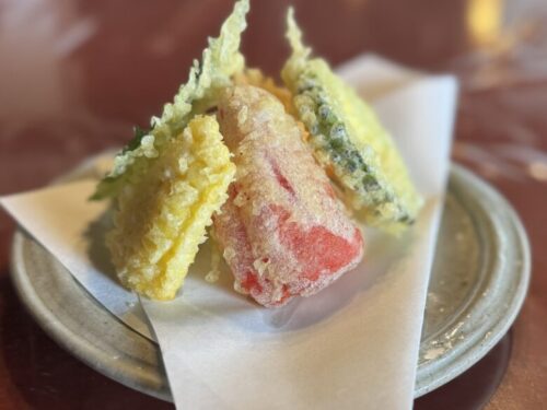 季節のお野菜の天ぷらです。見た目も芸術品のように美しい…。