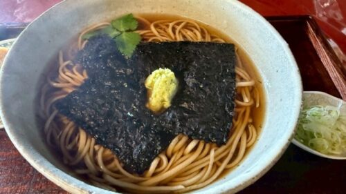 あたたかいお蕎麦に海苔が乗った花まきそばです。