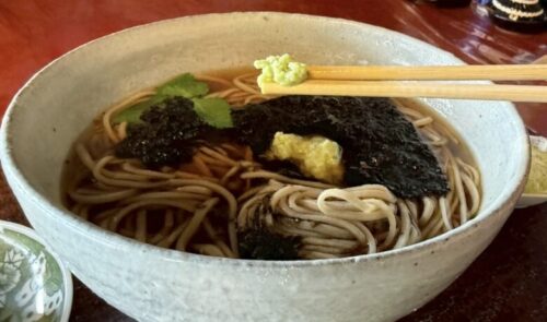 有明海の海苔がとろけて蕎麦に絡みます。お蕎麦はもりそばよりも細く、つるつると口の中に入ってきます。海苔、わさび、お出汁、全てが美しいバランスで器の中を彩っていて、どんどん無くなってしまうのが切なくなってきます。