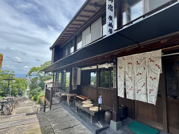 お腹が空いてるし暑いしで、本妙寺の階段を登るのは本日はパス。熊本玉名線を本妙寺の階段に沿って車で上がってゆきます。道に「廣嶋屋」の案内がありますので、すいすいっと登ってゆき、こちらの看板より右折します(下から上がってきた場合)