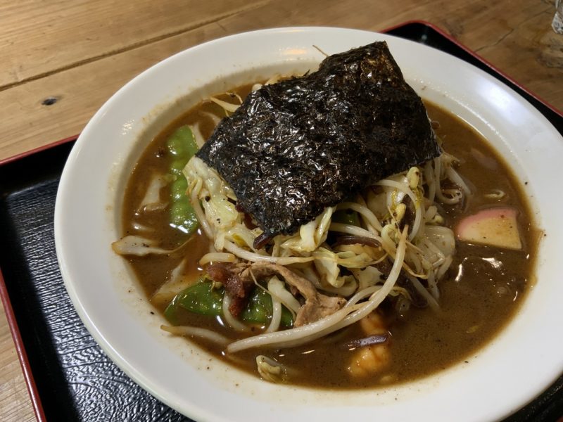 スープは豚骨より濃い茶色です。野菜もたっぷり乗っています。