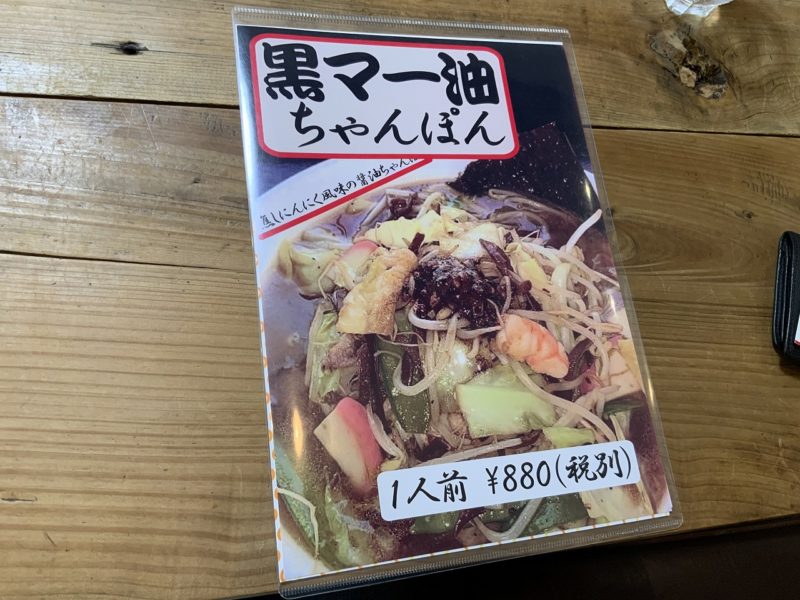 店主に「食べてみて」とオススメされたのが、こちらの「黒マー油ちゃんぽん」。ベースは同じ醤油ちゃんぽんですが、焦がしにんにくと黒マー油が入っていてまるで熊本ラーメンのよう。