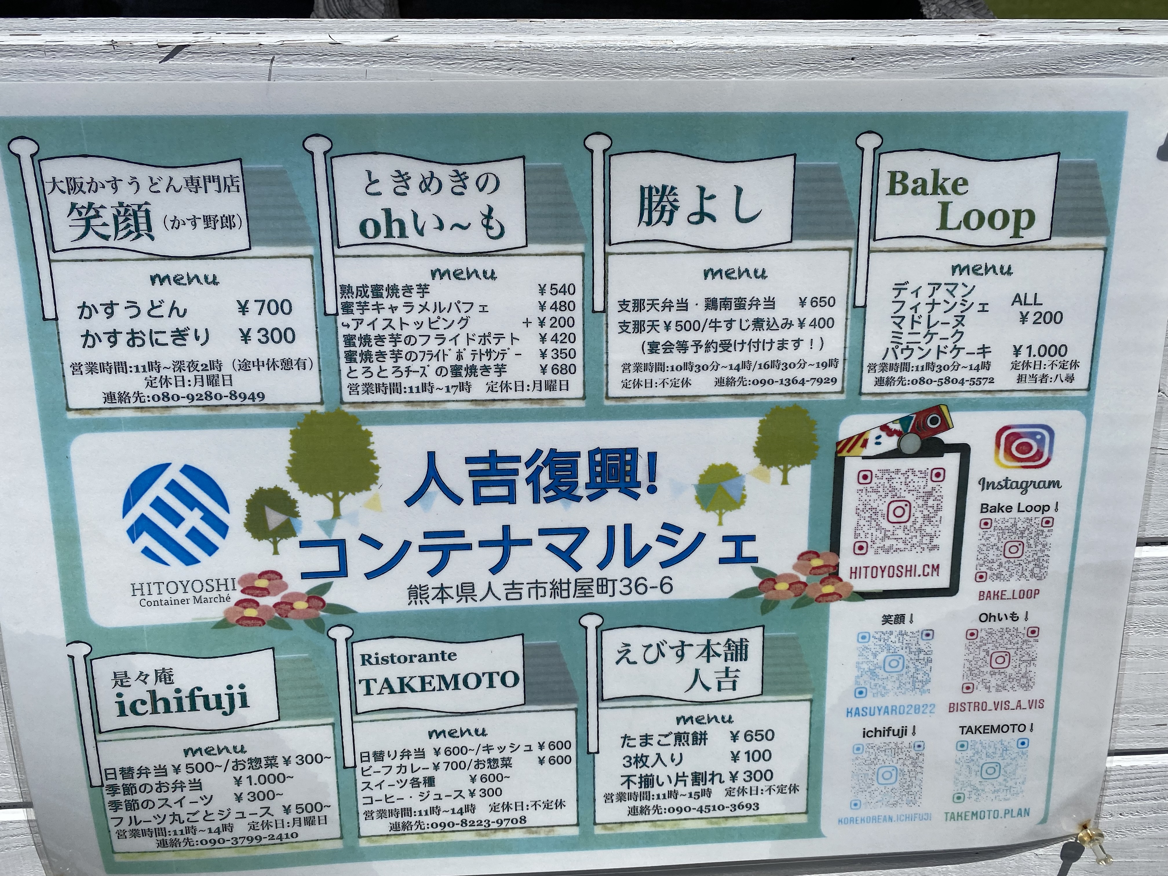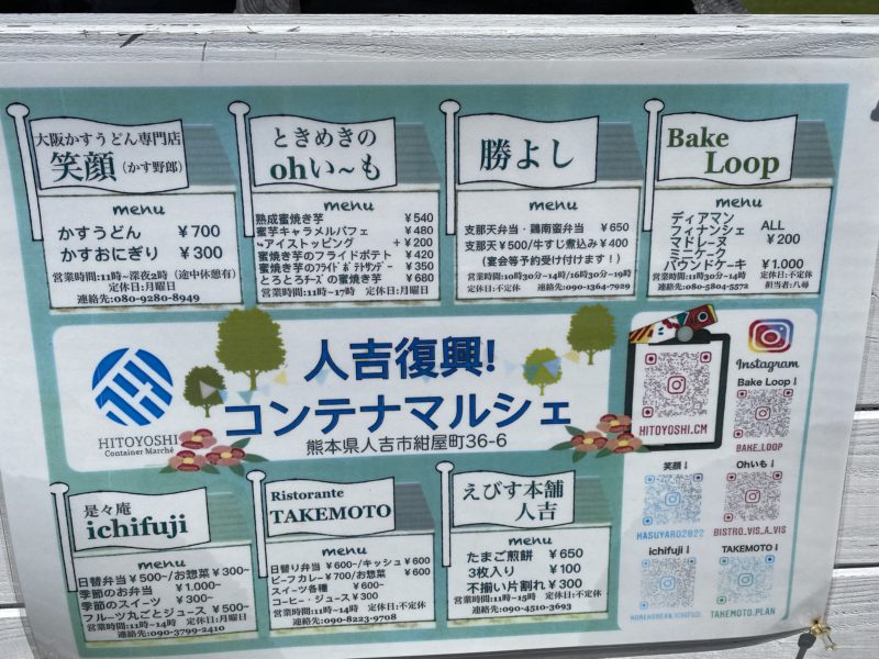 | SNS | https://www.instagram.com/hitoyoshi.cm/ かすうどん https://www.instagram.com/kasuyaro2022/ ときめきのohい~も https://www.instagram.com/tokimekino.oh.imo/ BakeLOOP https://www.instagram.com/bake_loop/ TAKEMOTO https://www.instagram.com/takemoto.plan/ 是々庵ichifuji https://www.instagram.com/explore/tags/%E6%98%AF%E3%80%85%E5%BA%B5ichifuji/ |