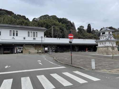 お城をモチーフにした人吉駅。駅を背にして右手に見えるのがホテル「天守閣」