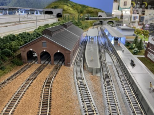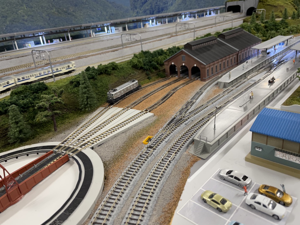 構内や車庫も芸が細かい!しかもほとんどの建物がオリジナルってことは手作りなんです。