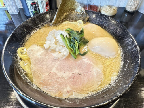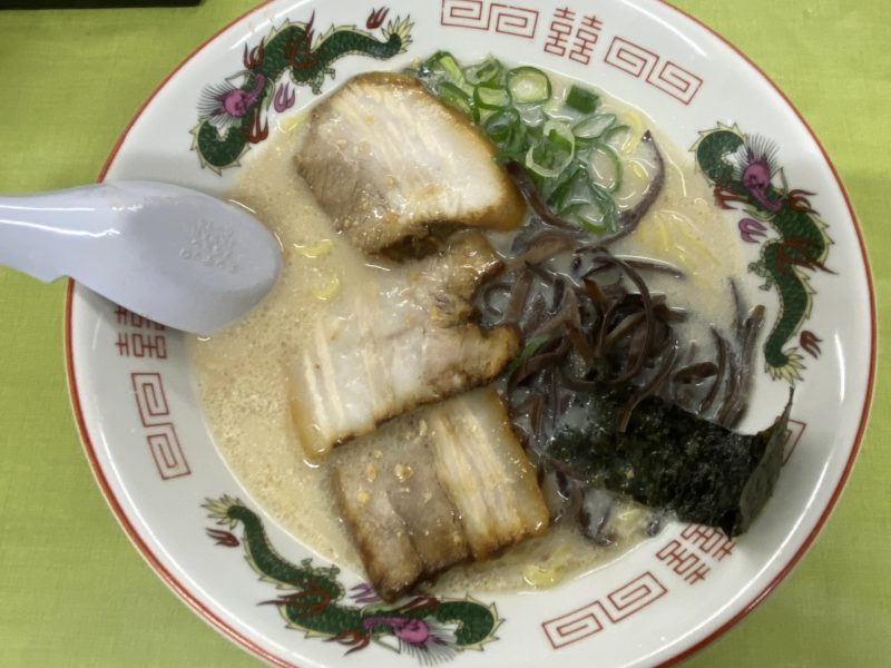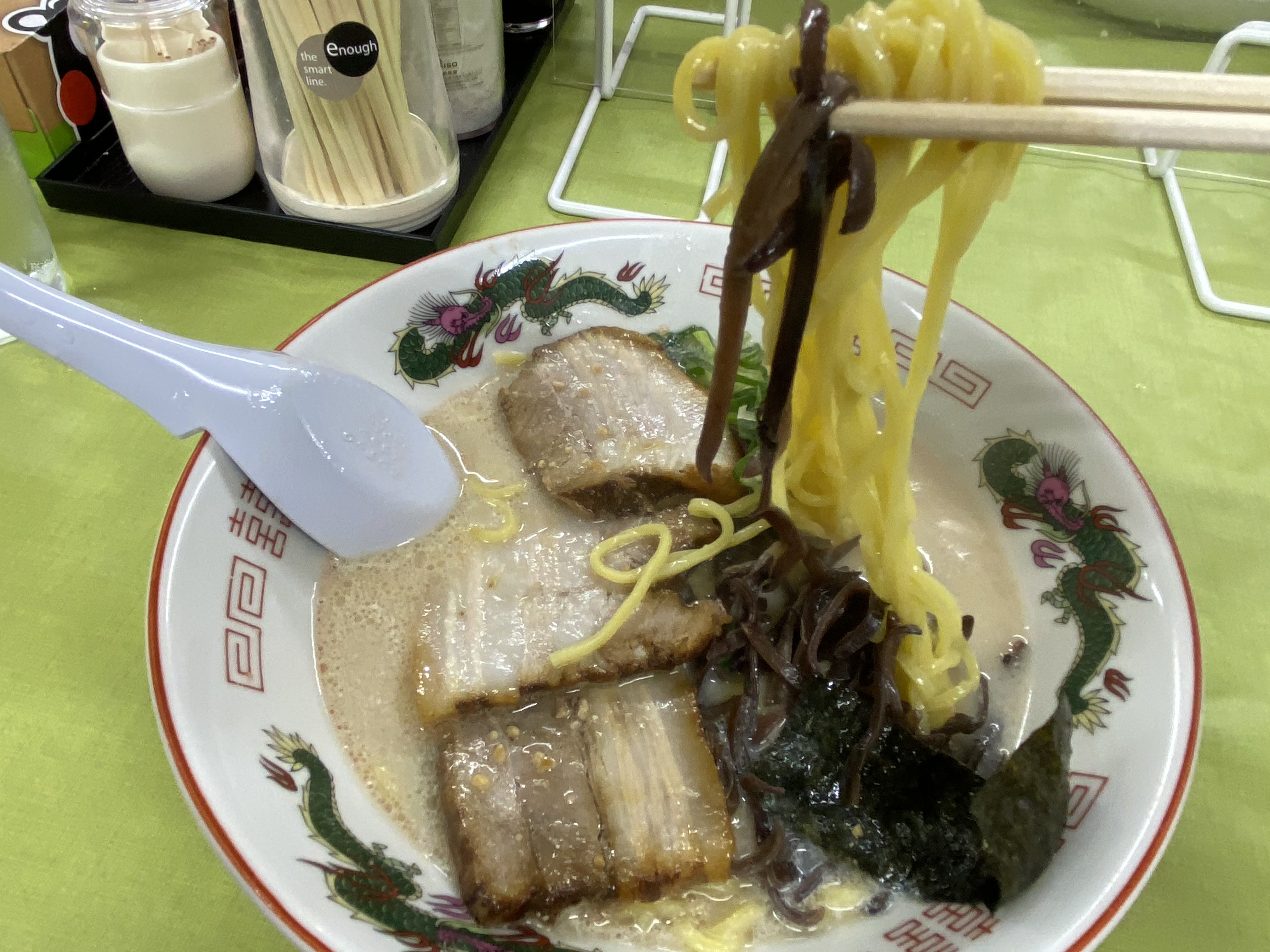 とんこつスープに肉厚のチャーシューが3枚。海苔ときくらげとフライドガーリックがトッピングされています。これで600円。普通のとんこつラーメンならワンコインで食べられます。