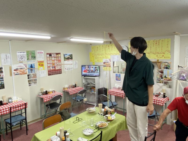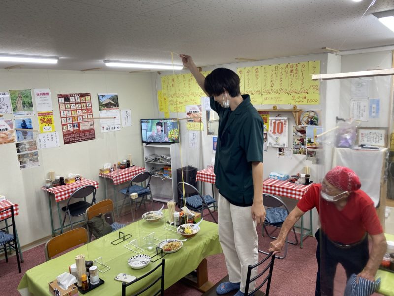 いただーーーーーきまーーーーす!なげえよ!椅子に乗って天井まで箸を上げてもまだ麺はどんぶりの中から出てきます。なんと6mの麺だそう。自家製なので、どんだけでも長くできるそう。