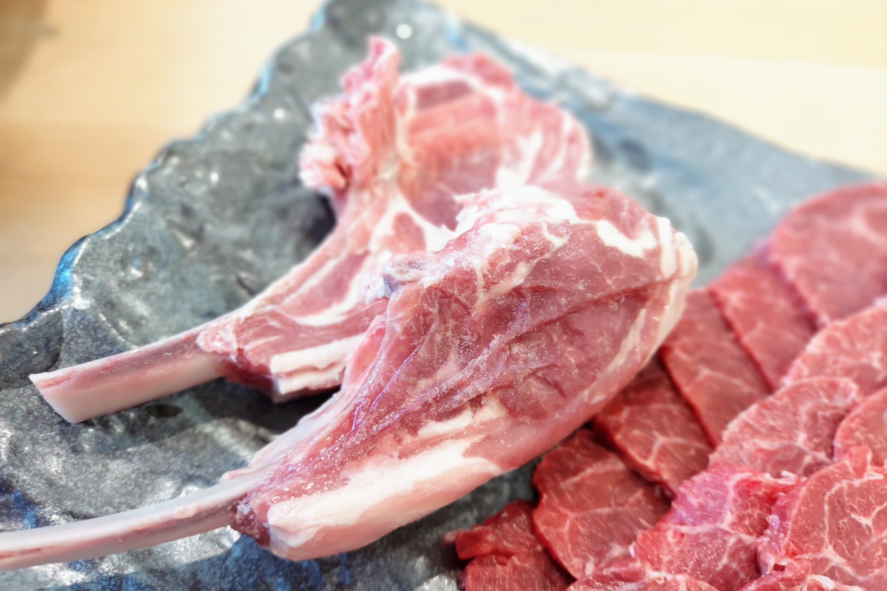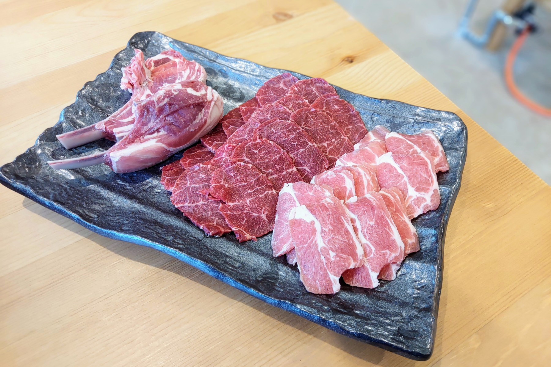 まずはラム肉の三種盛り合わせ。