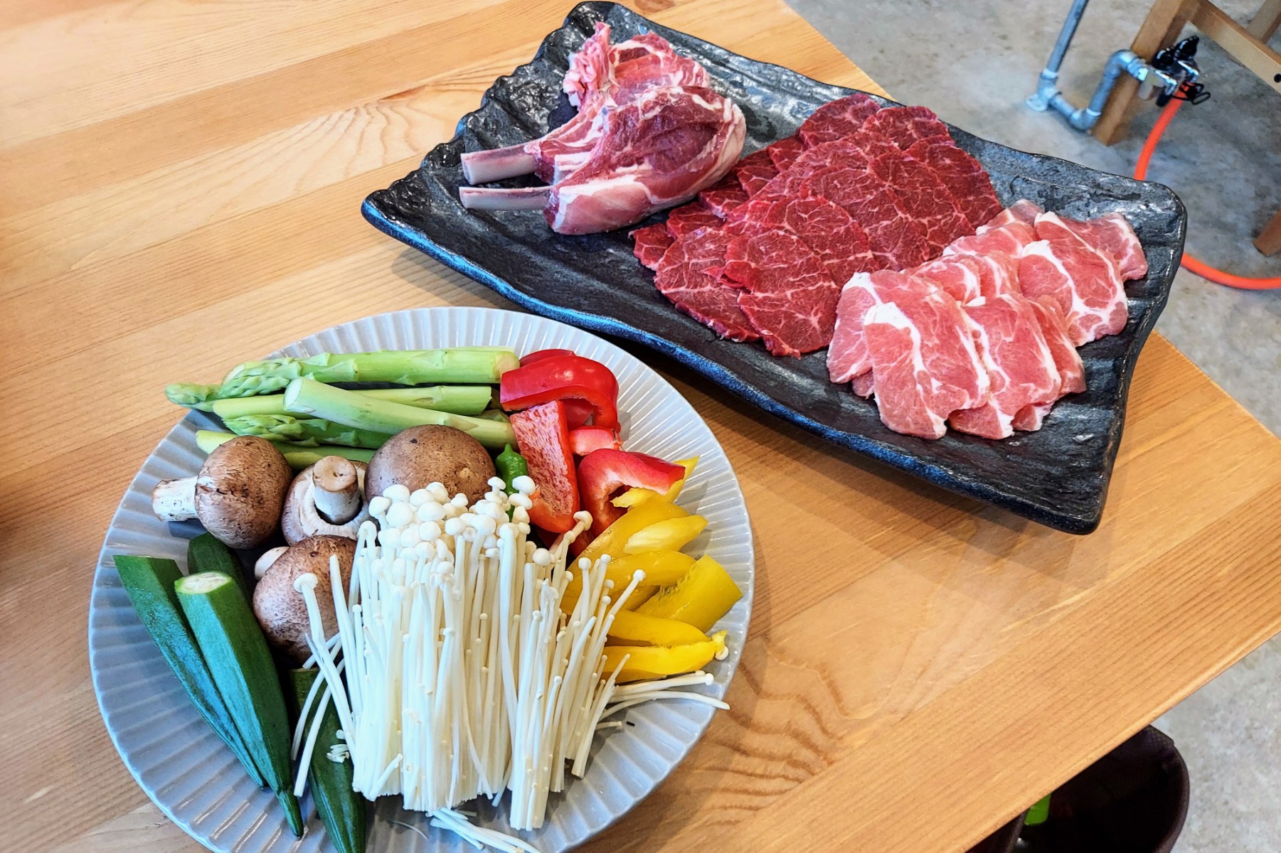 お肉を鍋の真ん中に乗せていき、鮮やかな野菜達を周りに配置していきます。