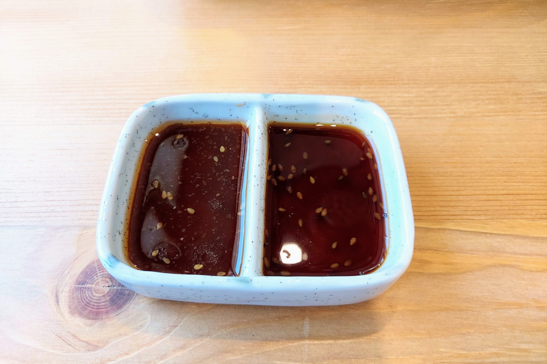 タレは2種類あり、左の濃い方がブレンド。右の薄い色が醤油ベースのタレとなっています。