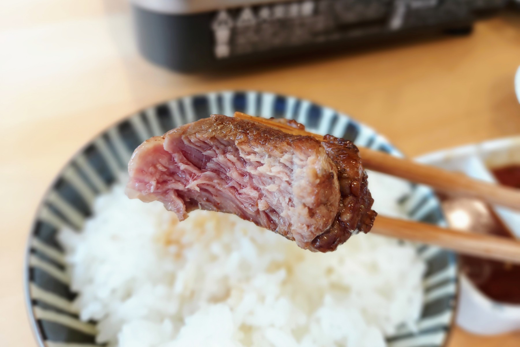 ロースとランプはあっという間に焼けたので、タレにつけていただきます。