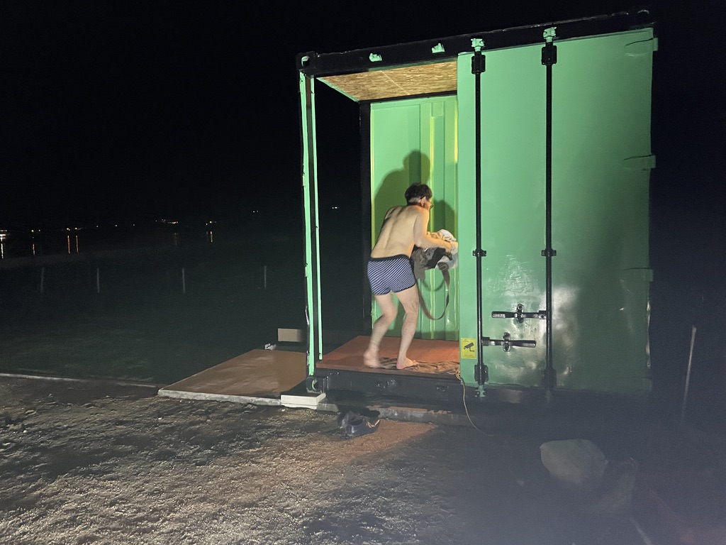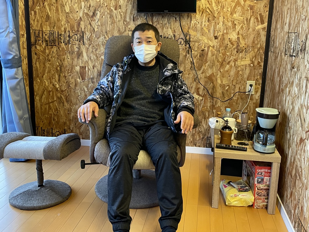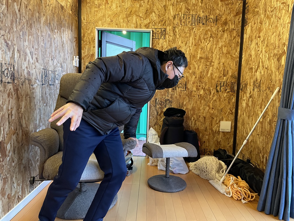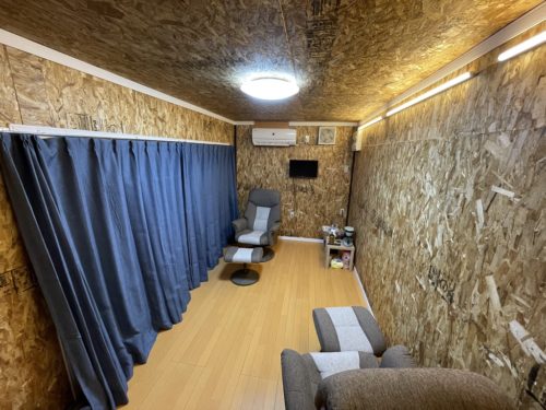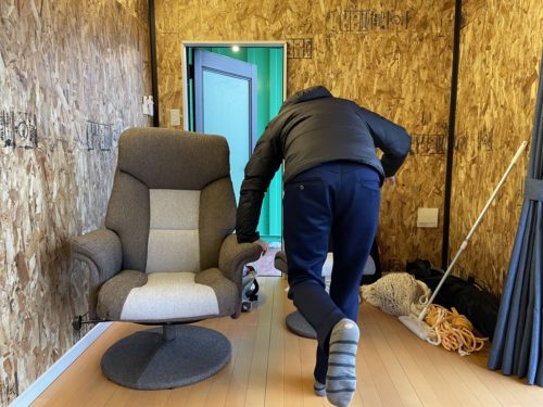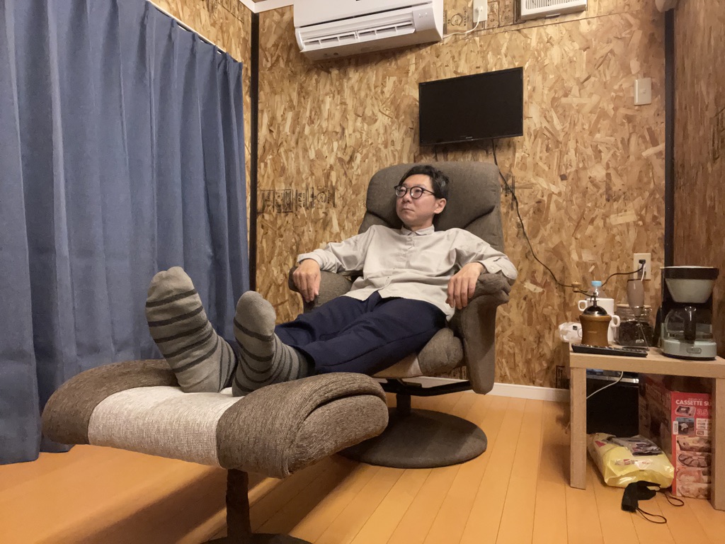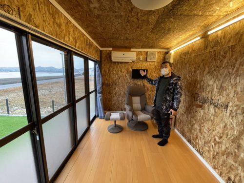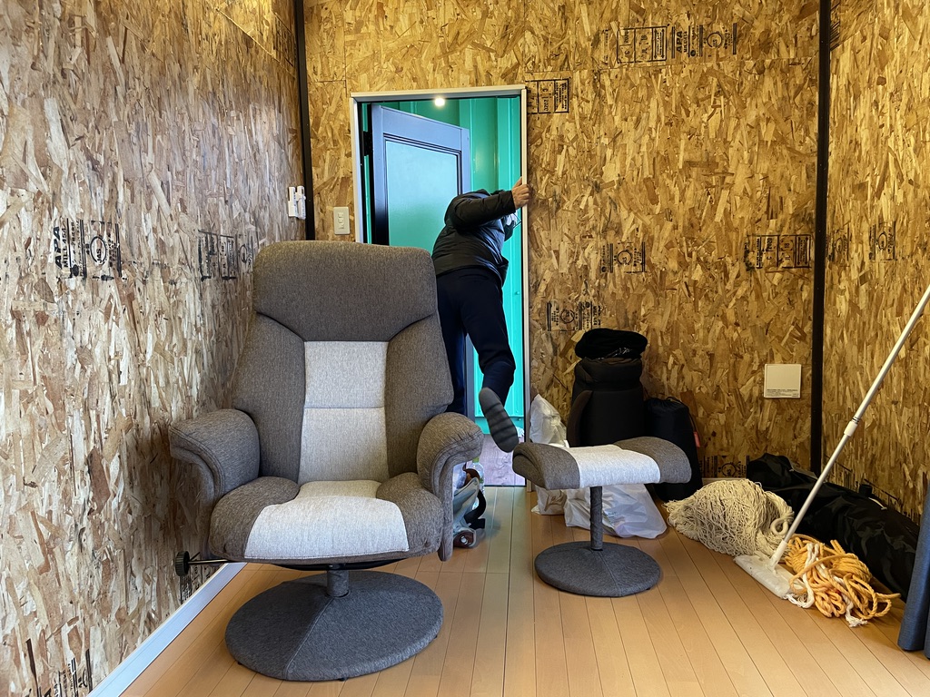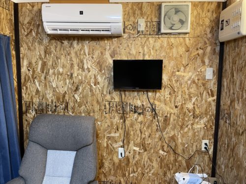 寒い寒い言いながら飛び込んだコンテナハウス、中にはエアコン・テレビ・リクライニングシートなど、一晩過ごすには十分すぎる設備。