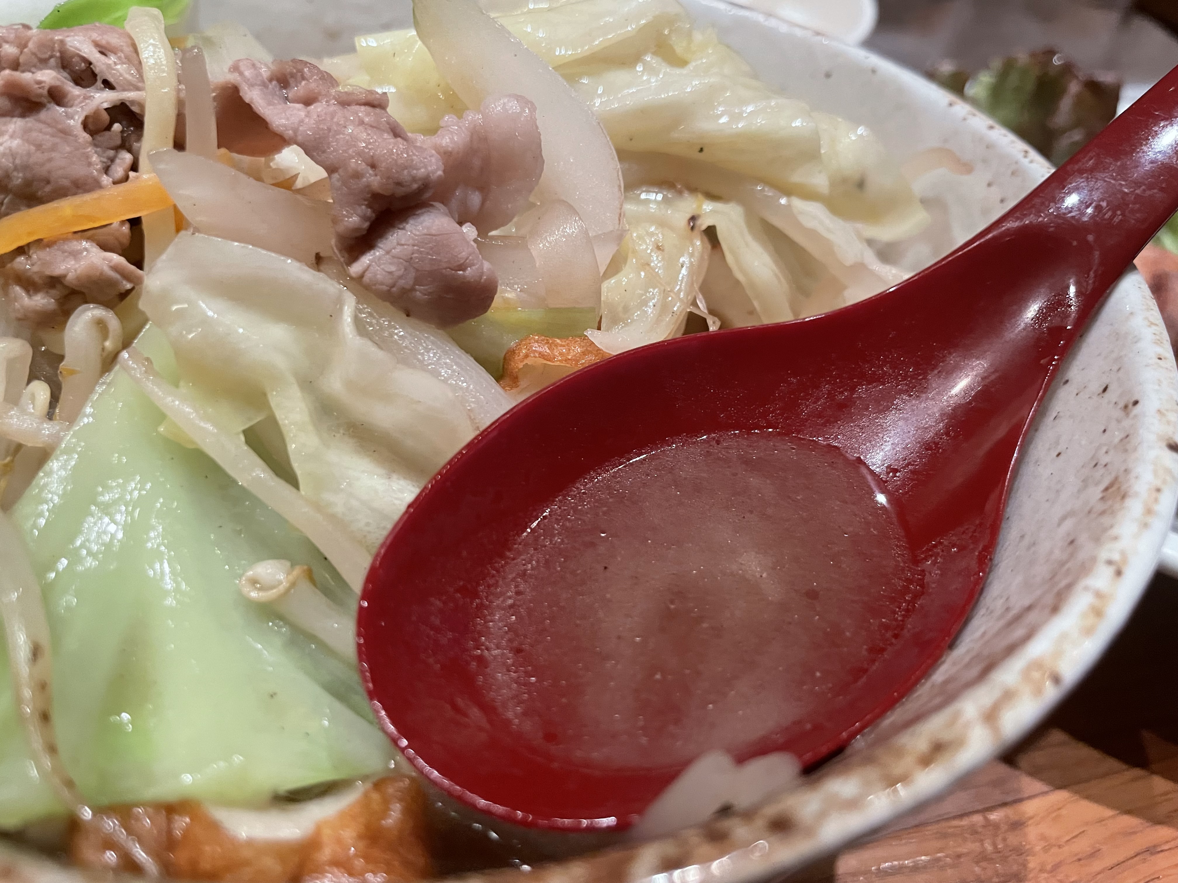 透き通った御出汁です。飲むと、野菜のエキスと濃い目の出汁&醤油がけっこうなパンチ力。