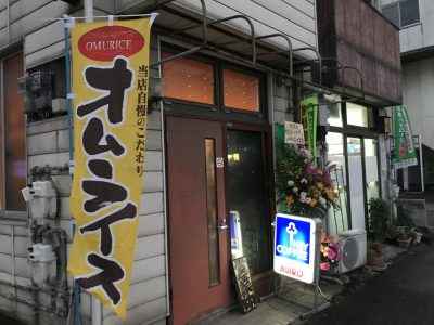 場所は子飼橋近くで、渡鹿方面から来ると、子飼橋を渡る直前の交差点を右折した角です。。目印は小さな看板と、オムライスの幟(のぼり)です。