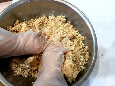 各テーブルでボウルの底からしっかり麹を塩を混ぜ合わせ麹作りをします。「おいしくなぁれ」と唱えながら麹をしっかり混ぜます。
