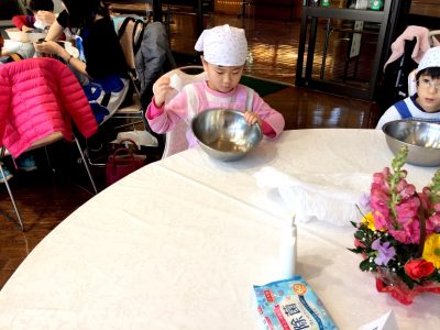 持参する物はエプロン、三角巾、ボウルです。
