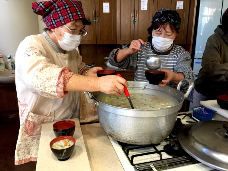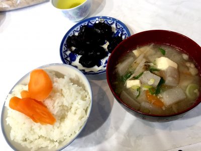 つくったあとは、あたたかいごはんと豚汁で楽しくお食事で本田さんが作ったお米とお味噌を使っています。