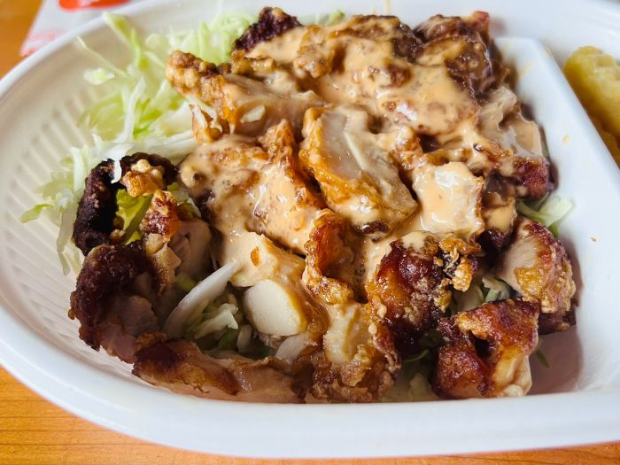 このおかずは一口サイズに切ってある唐揚げにサウザンアイランドドレッシングがかかっています。